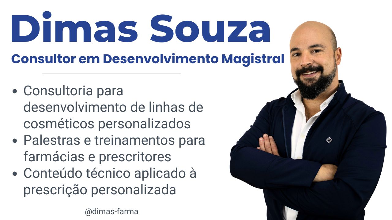 Dimas Souza é farmacêutico especialista em farmácia magistral, com atuação desde 2001. Mestre em Ciências Farmacêuticas pela UFRGS (2007), construiu uma trajetória técnica sólida na área de desenvolvimento de formulações personalizadas voltadas à estética e dermatologia.